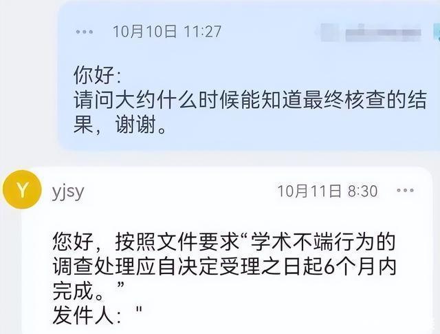 10月该网友追问进展时,校方表示“学术不端行为的调查处理应自决定受理之日起6个月内完成”。