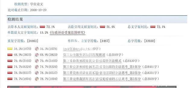 该网友公开的知网查重报告显示:杨某某2008年完成的硕士论文《我国行政诉讼受案范围研究》,总文字复制比达72.1%(比对截止日期为2008年10月20日)。