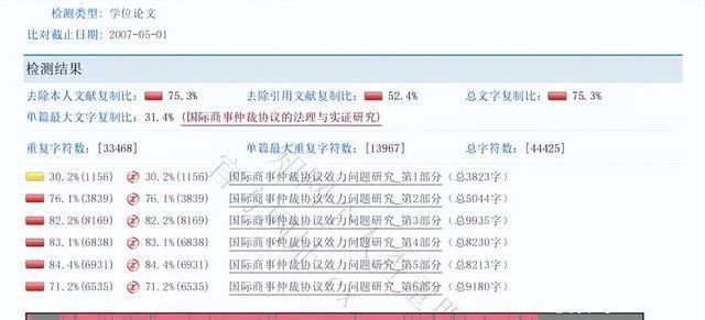 张某某2007年完成的《国际商事仲裁协议效力问题研究》,总文字复制比更高达75.3%(比对截止日期为2007年5月1日)。